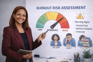 Measures signs of work-related burnout (exhaustion, cynicism, reduced efficacy).